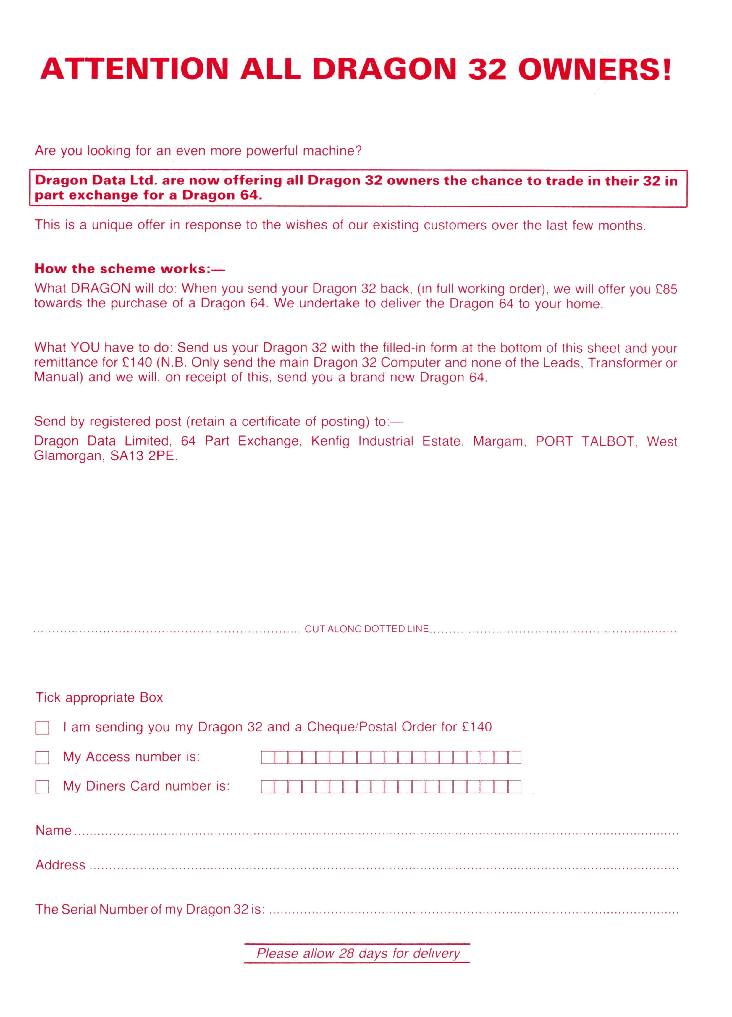 | Third and fFinal Edition April 1984 85MB PDF | Software order form, sent with Dragon World |
